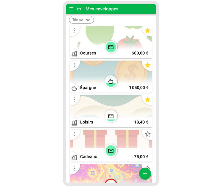 Choisissez la couleur, l’icône ou même une image pour chaque enveloppe : votre budget devient vraiment le vôtre.