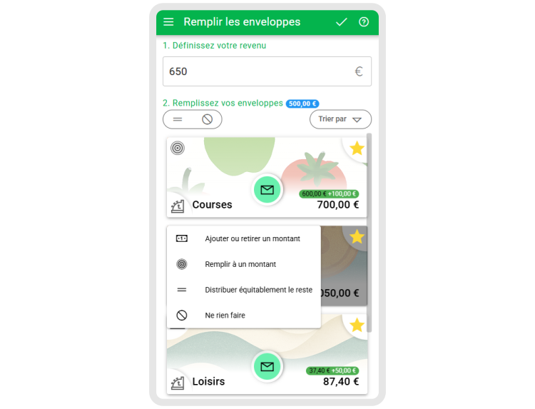Visualisez d’un coup d’œil vos enveloppes et les sommes restantes — pour garder le contrôle, facilement.